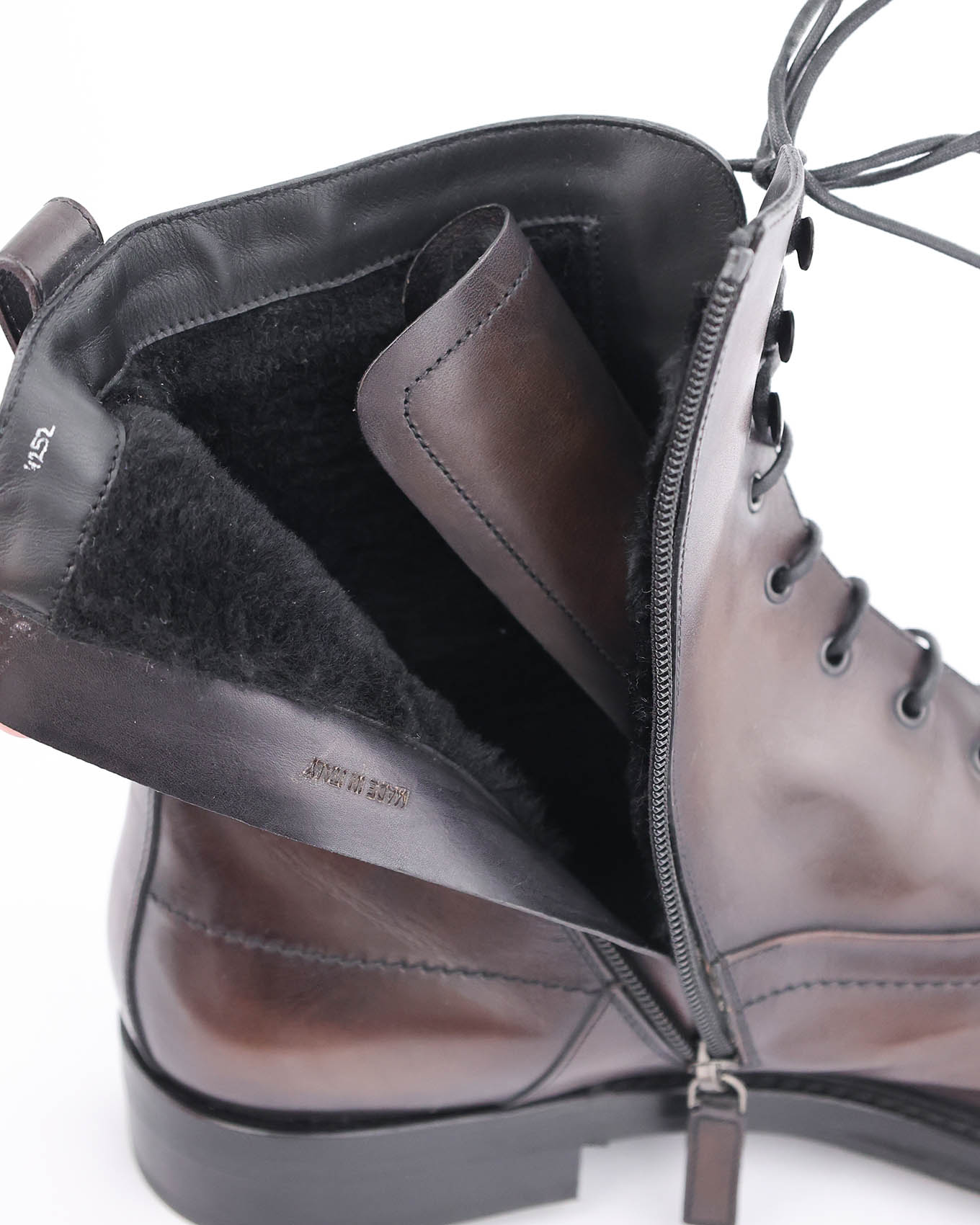 Up for sale is this beautiful pair of Berluti Bergen lace boots from Haider Ackermann's Fall Winter 2017 Runway Collection. This pair is made of dark brown calf leather with fur lining (presumably mink). The Bergen model features zipper closure on the inner part of the shoes, round toe caps and a rubber sole which makes this a quite comfortable pair of boots - ideal for regular wear.