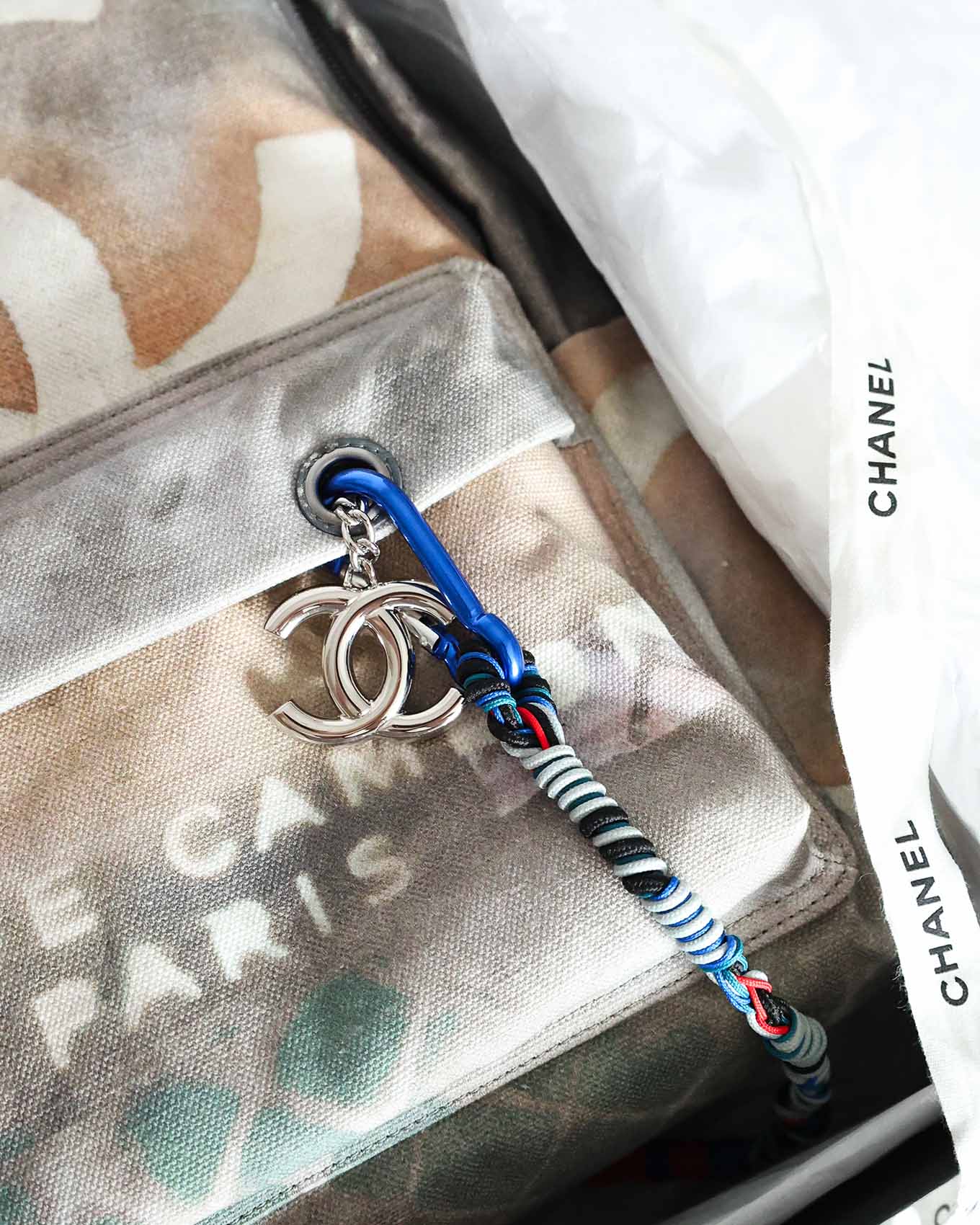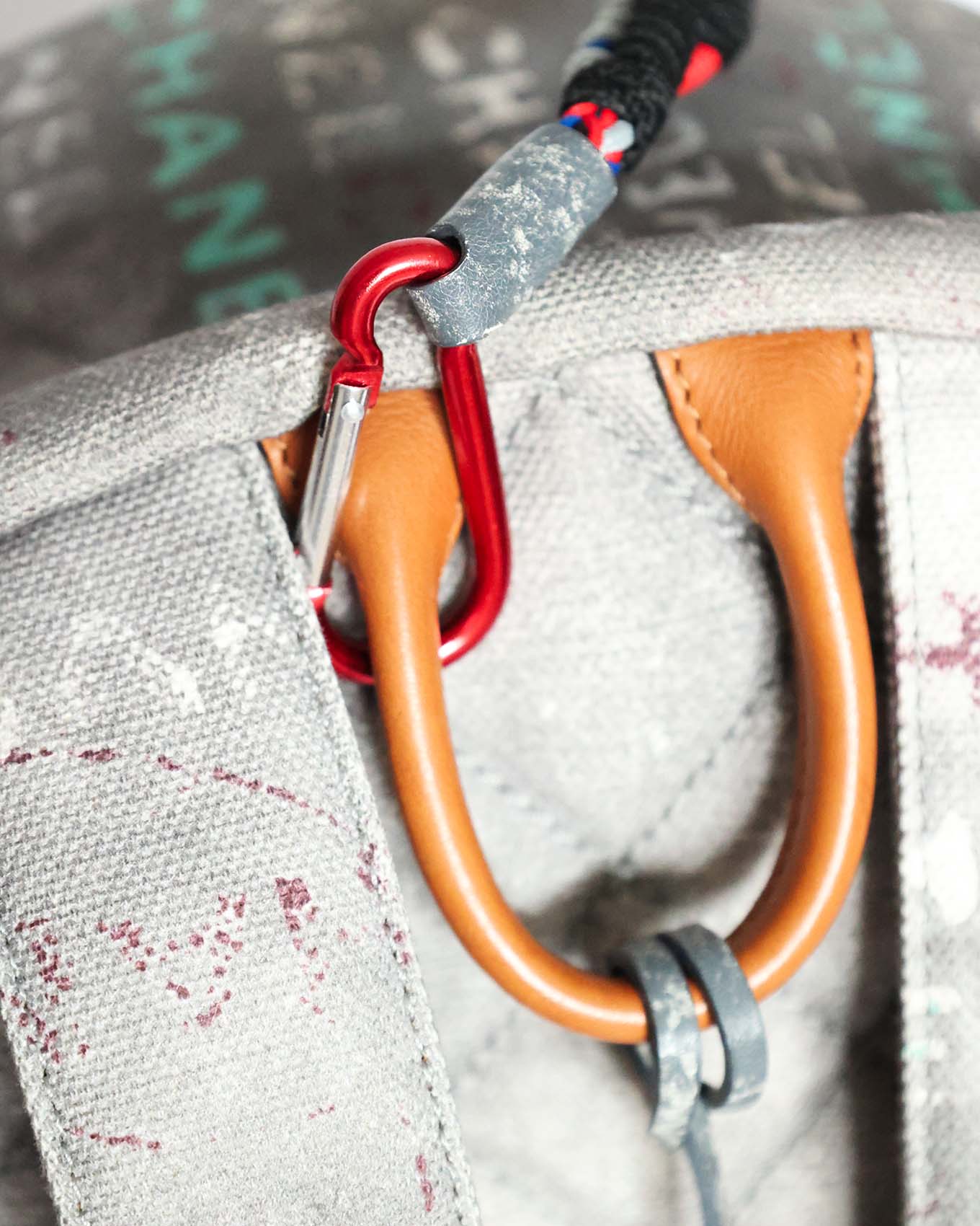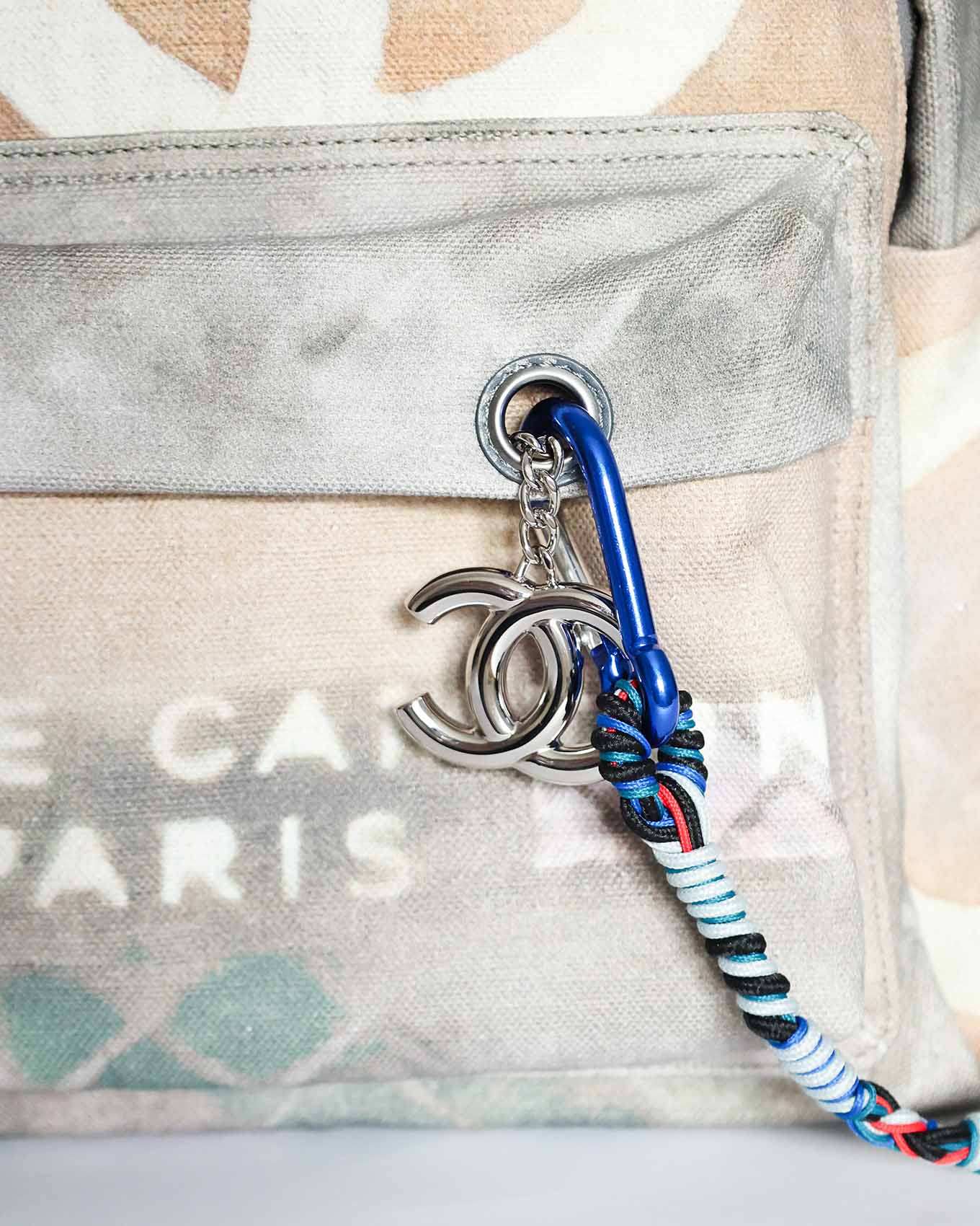 This Chanel Artclass Graffiti Backpack features a camel leather top handle and a total of three compartments. The rope chain accessoire is firmly attached by a red carabiner to the top handle. The accessoire includes a logo engraved silver carabiner as well as a blue one at the very end. The set also includes a double CC metal pendant at the front flap and a keychain on the inside.