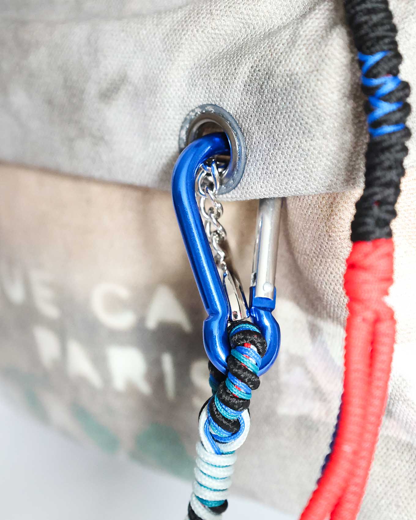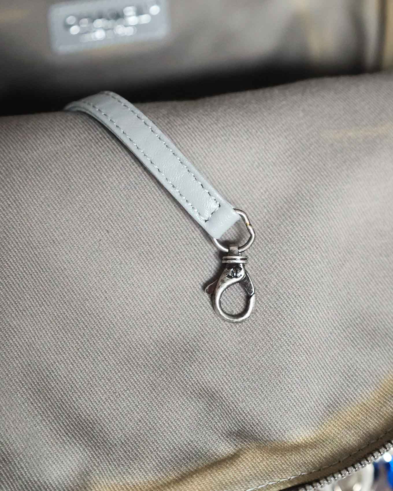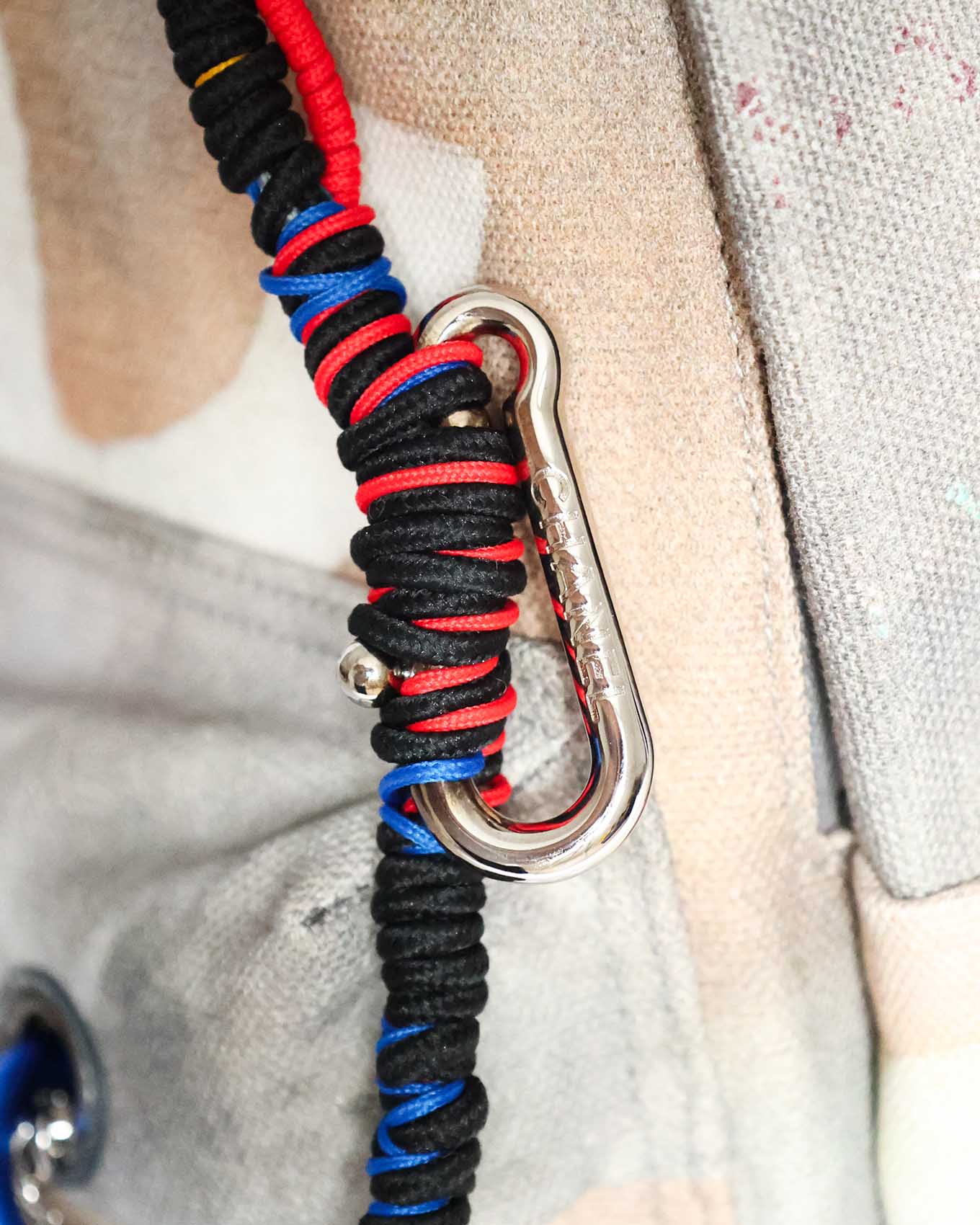 This Chanel Artclass Graffiti Backpack features a camel leather top handle and a total of three compartments. The rope chain accessoire is firmly attached by a red carabiner to the top handle. The accessoire includes a logo engraved silver carabiner as well as a blue one at the very end. The set also includes a double CC metal pendant at the front flap and a keychain on the inside.