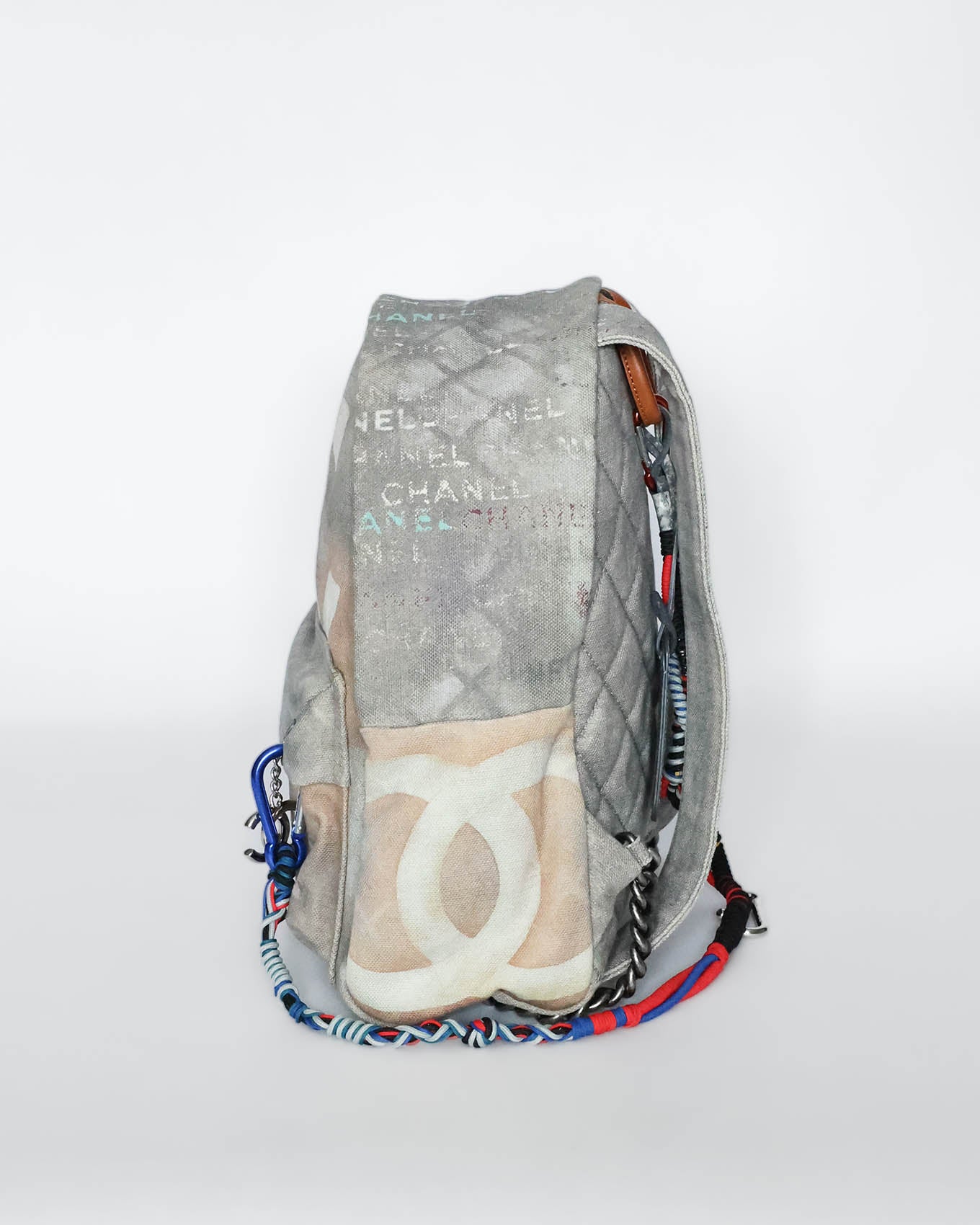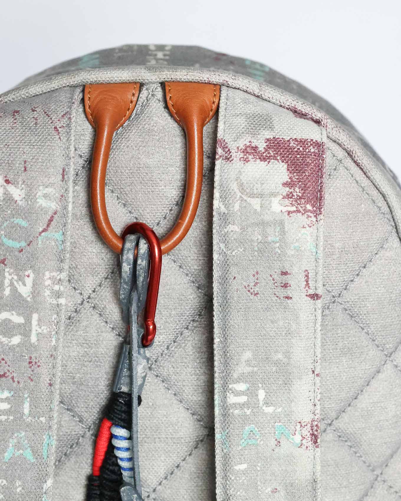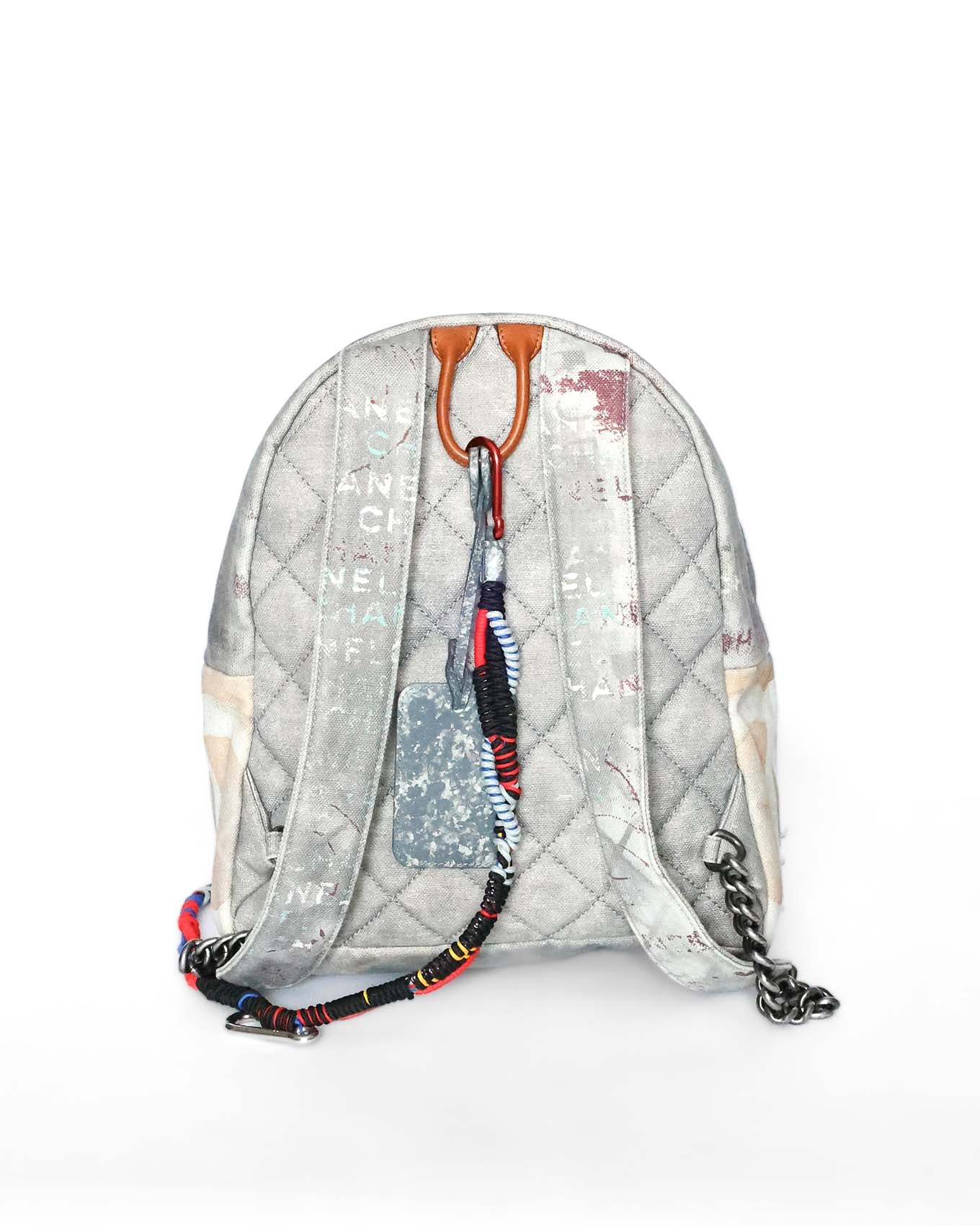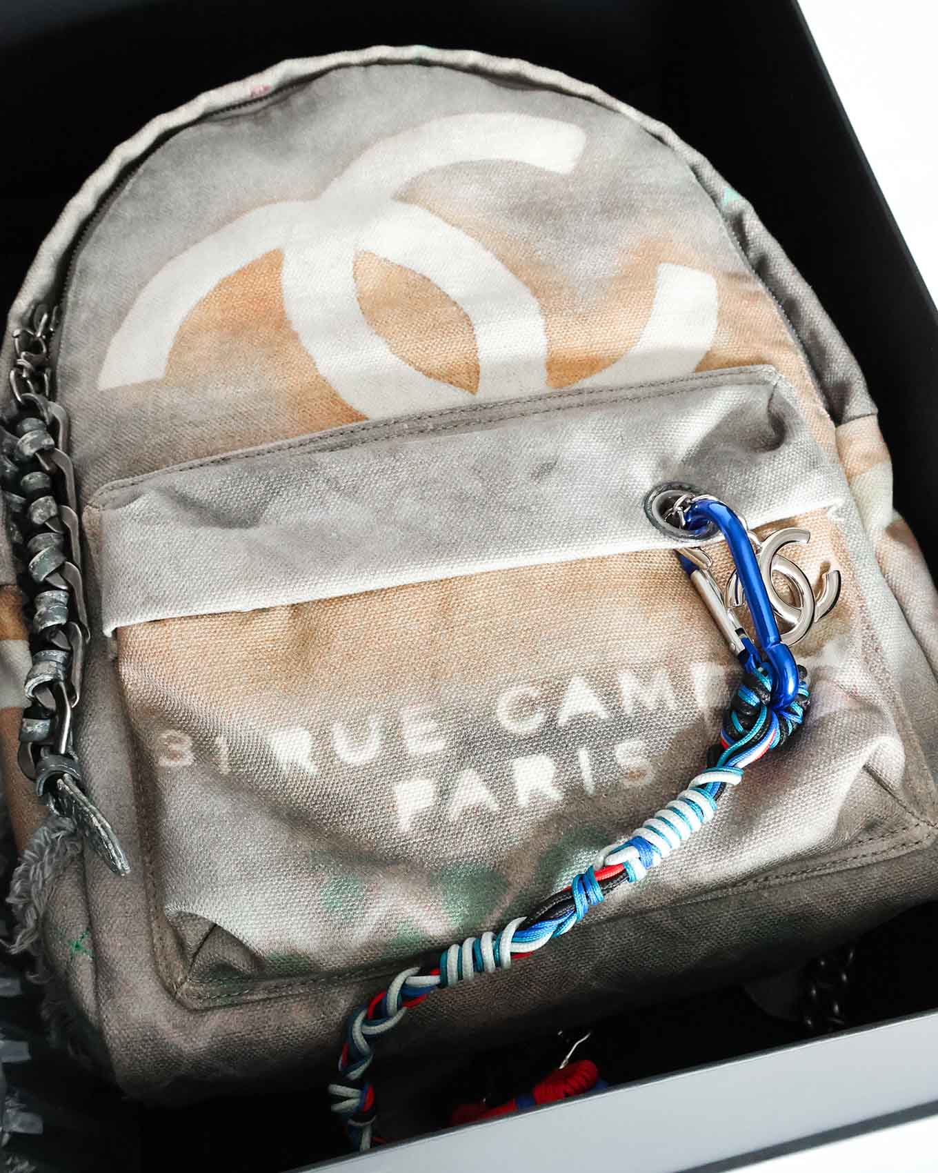 This Chanel Artclass Graffiti Backpack features a camel leather top handle and a total of three compartments. The rope chain accessoire is firmly attached by a red carabiner to the top handle. The accessoire includes a logo engraved silver carabiner as well as a blue one at the very end. The set also includes a double CC metal pendant at the front flap and a keychain on the inside.