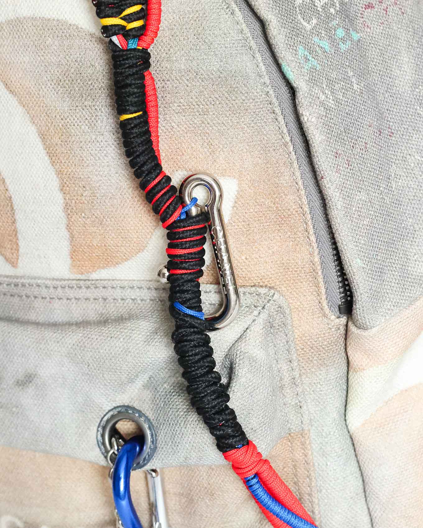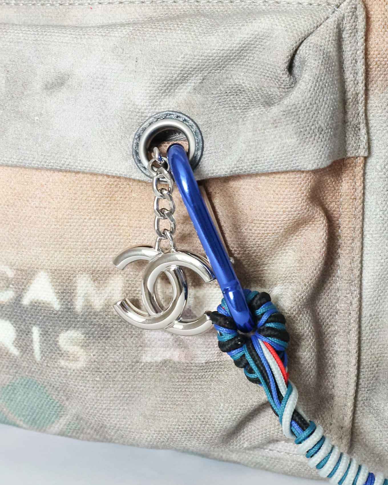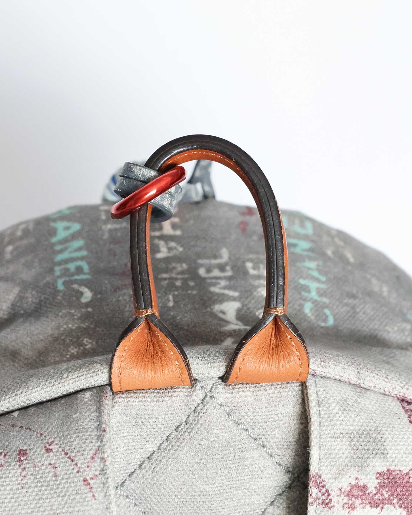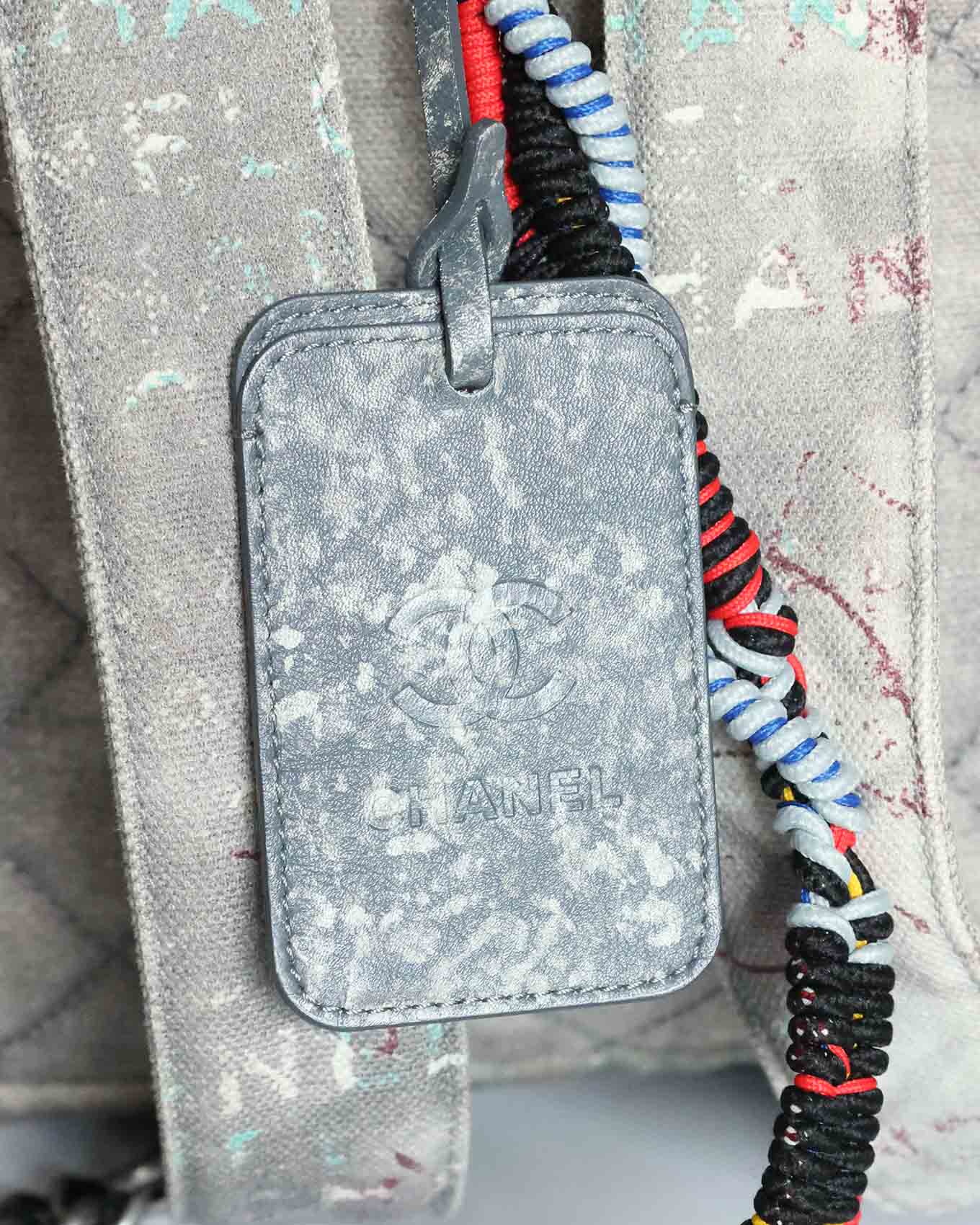 This Chanel Artclass Graffiti Backpack features a camel leather top handle and a total of three compartments. The rope chain accessoire is firmly attached by a red carabiner to the top handle. The accessoire includes a logo engraved silver carabiner as well as a blue one at the very end. The set also includes a double CC metal pendant at the front flap and a keychain on the inside.