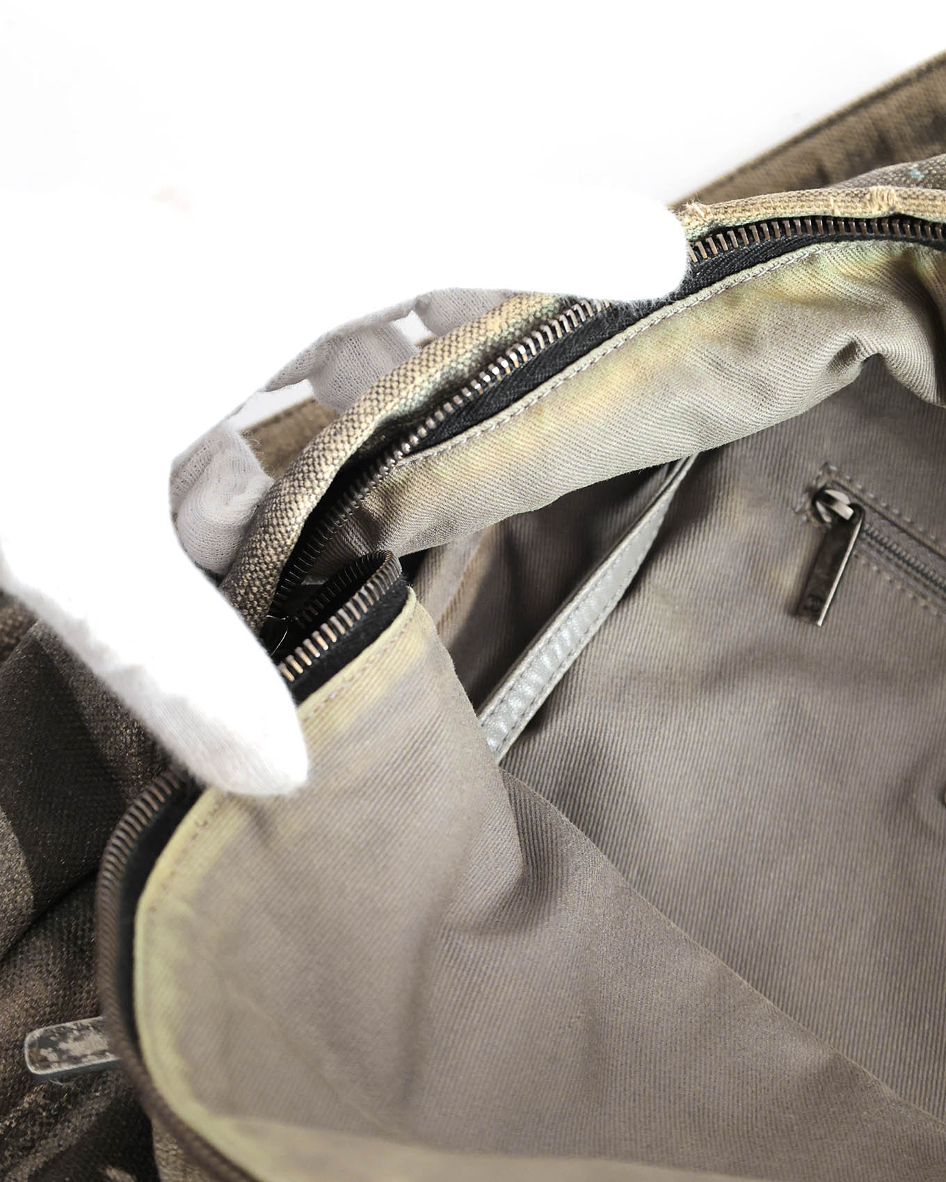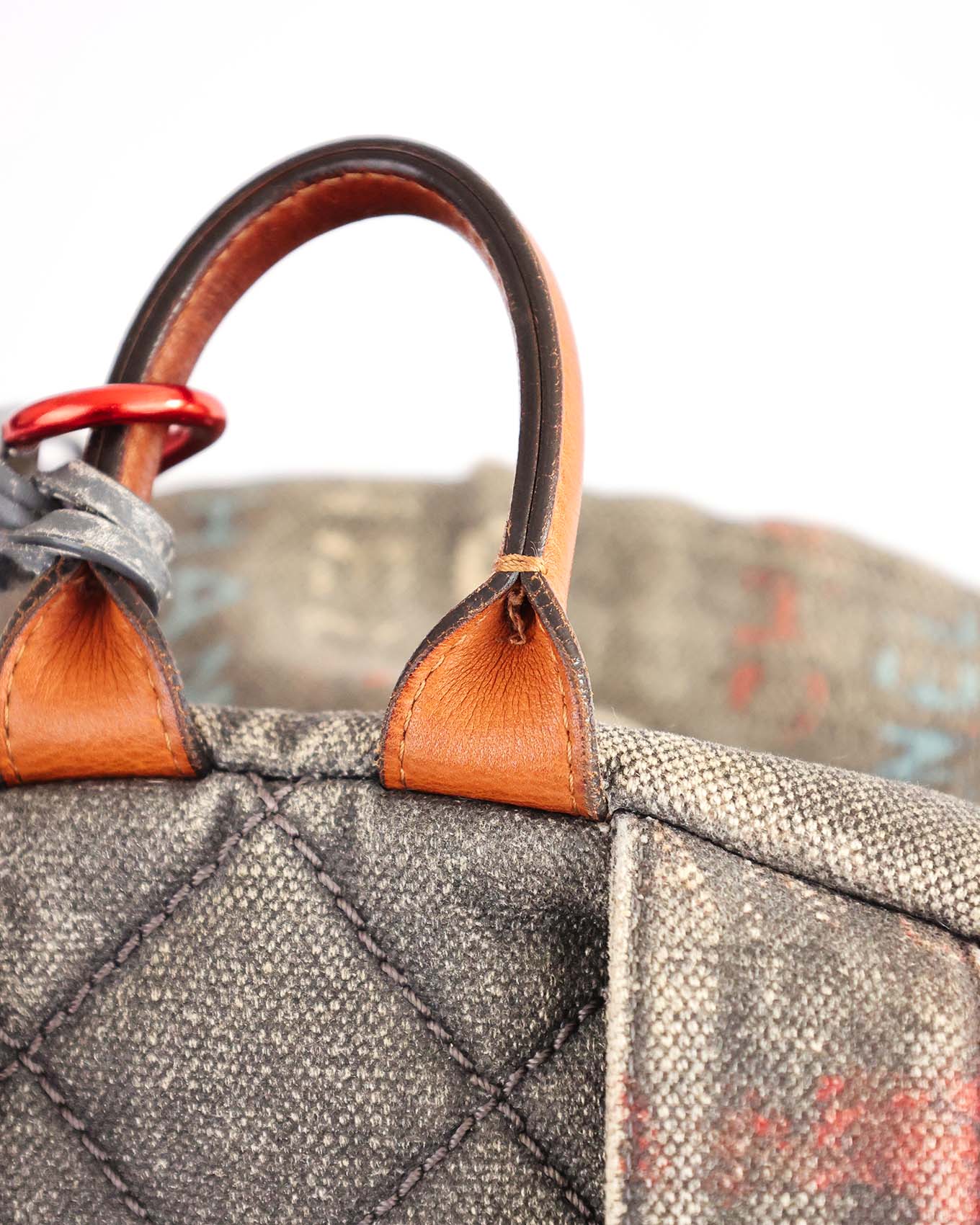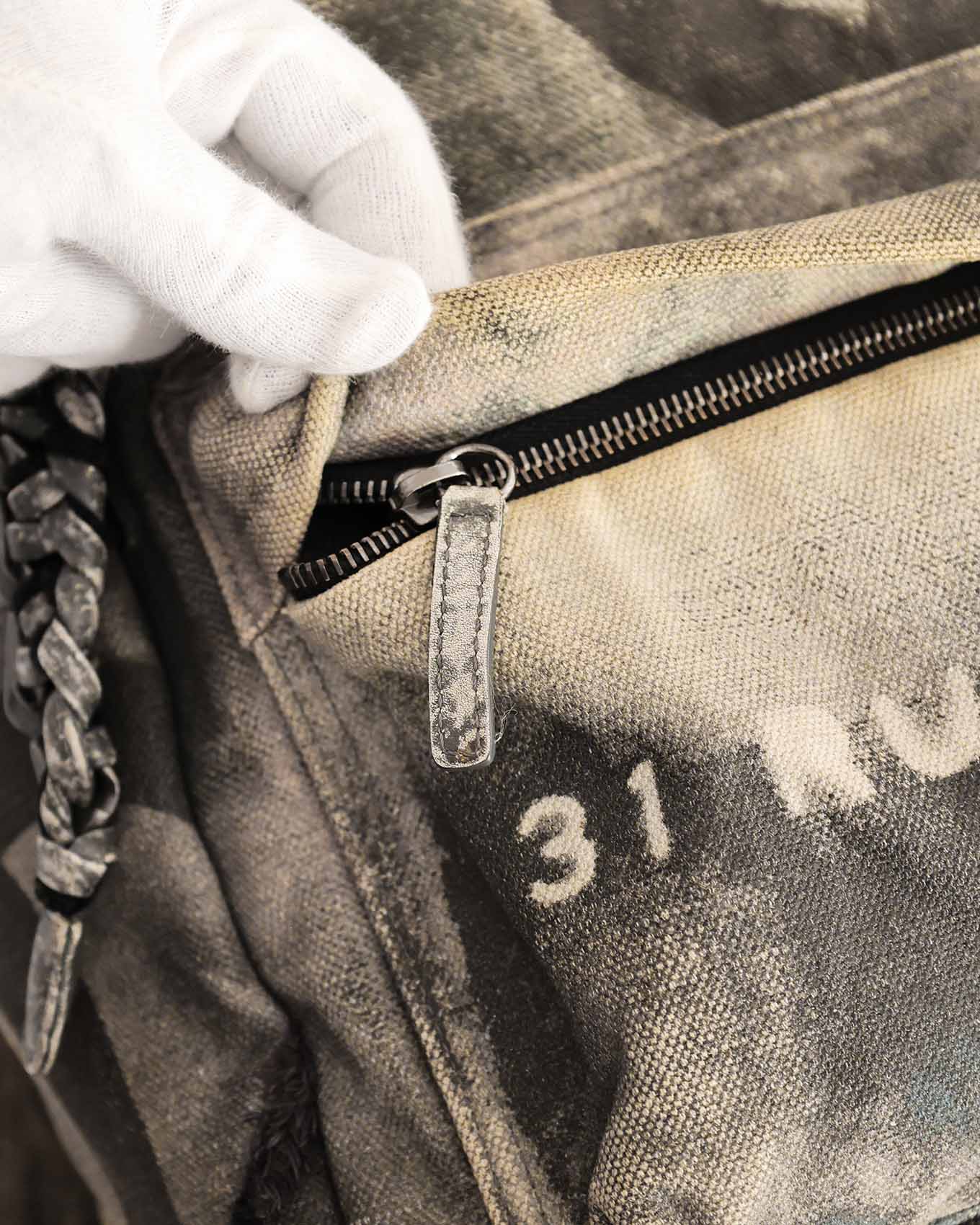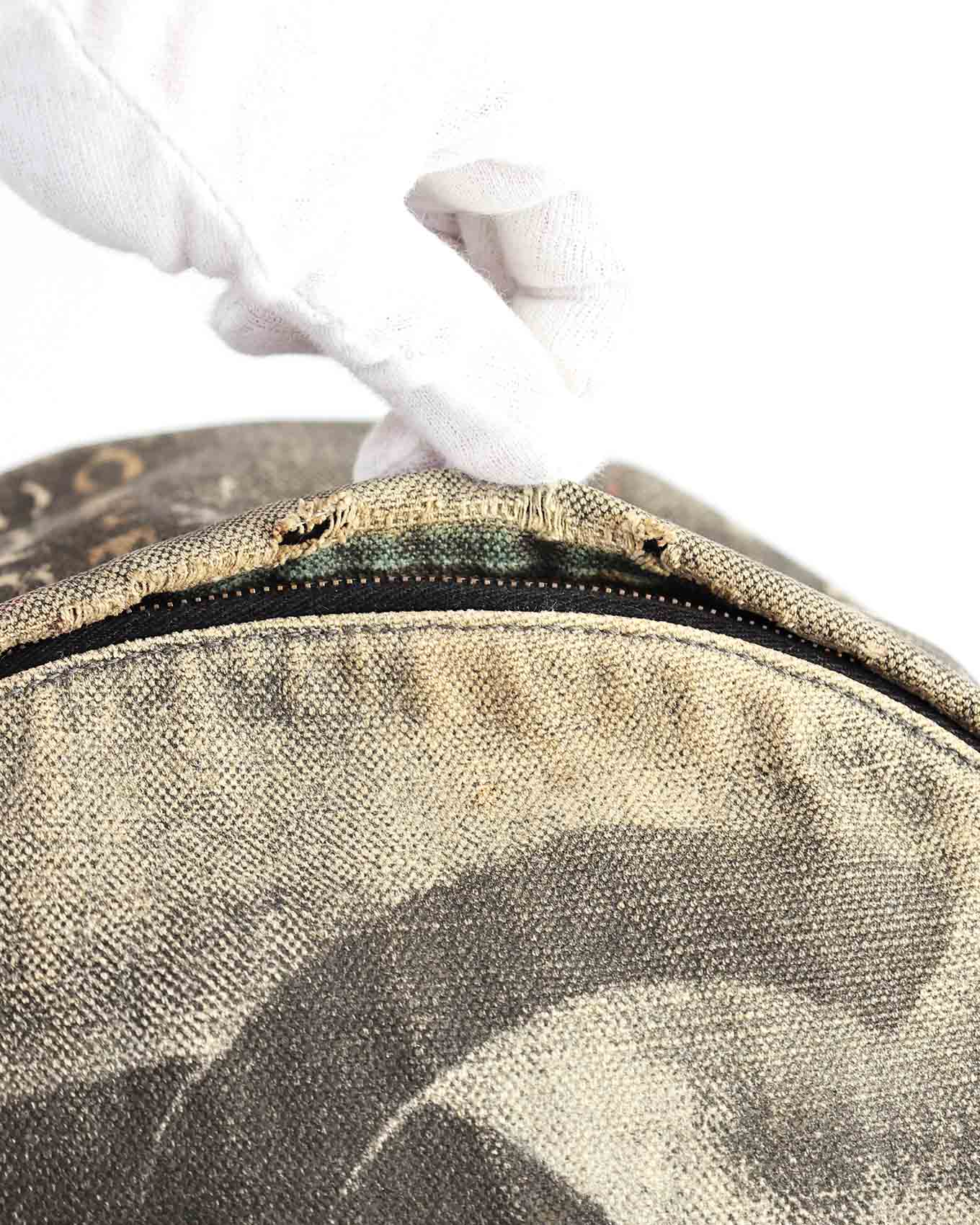 Good, has intended used look and signs of wear on the hardware. Due to the special bleaching treatment the canvas received the canvas shows some signs of discoloration on the in- and outside as well as some tear. This is common on authentic Graffiti Backpacks. The hardware shows clear signs of use. Overall in good condition.