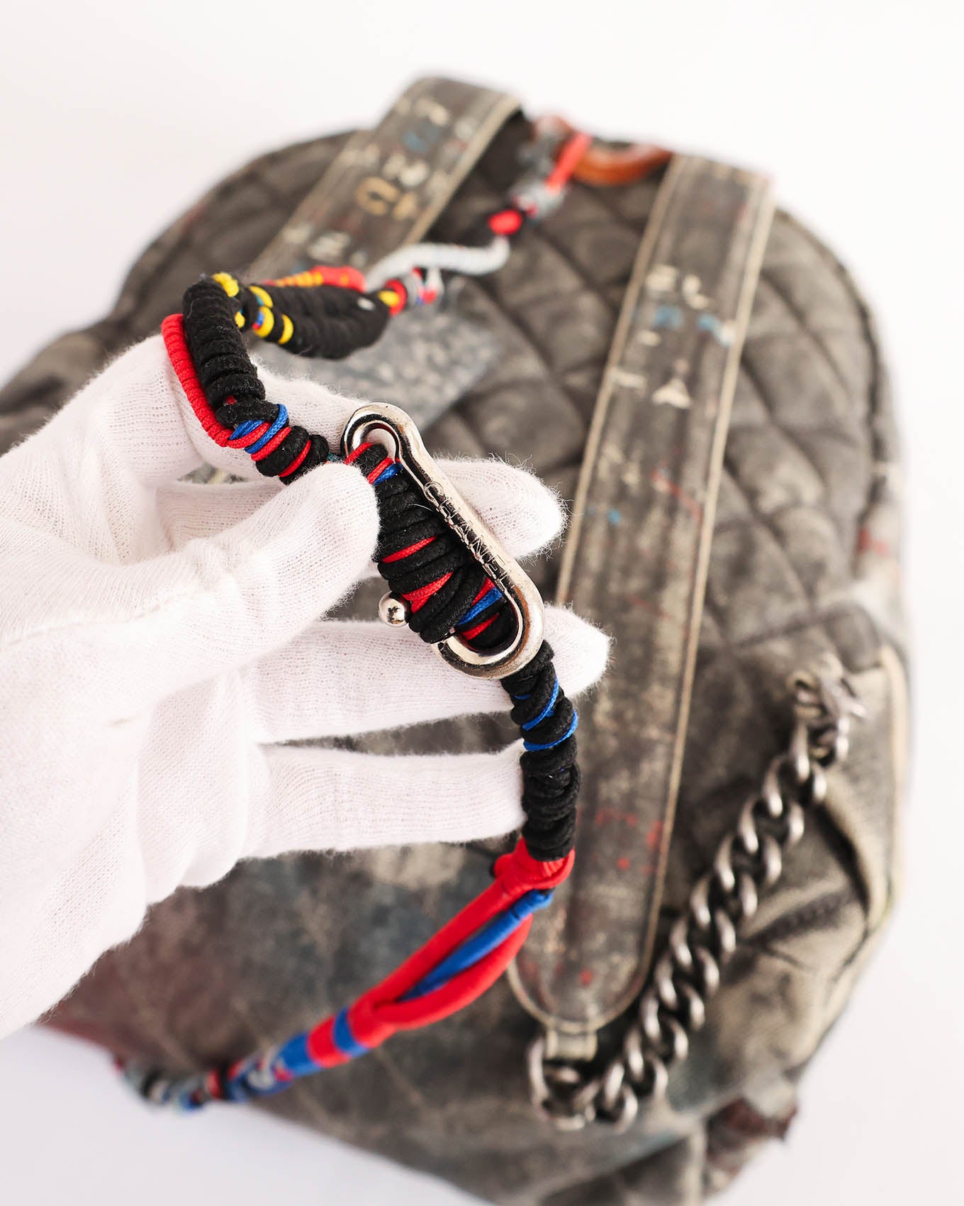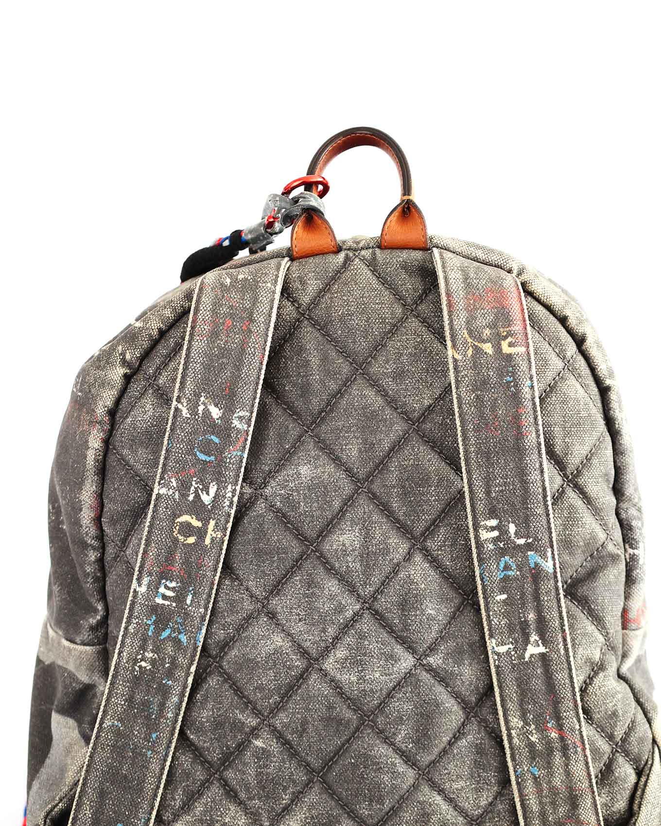 This Chanel Artclass Graffiti Backpack features a camel leather top handle and a total of three compartments. The rope chain accessoire is firmly attached by a red fixed carabiner to the handle but can be detached by the blue carabiner which offers various ways to carry and style. It also includes a double CC metal pendant at the front flap and a keychain on the inside.