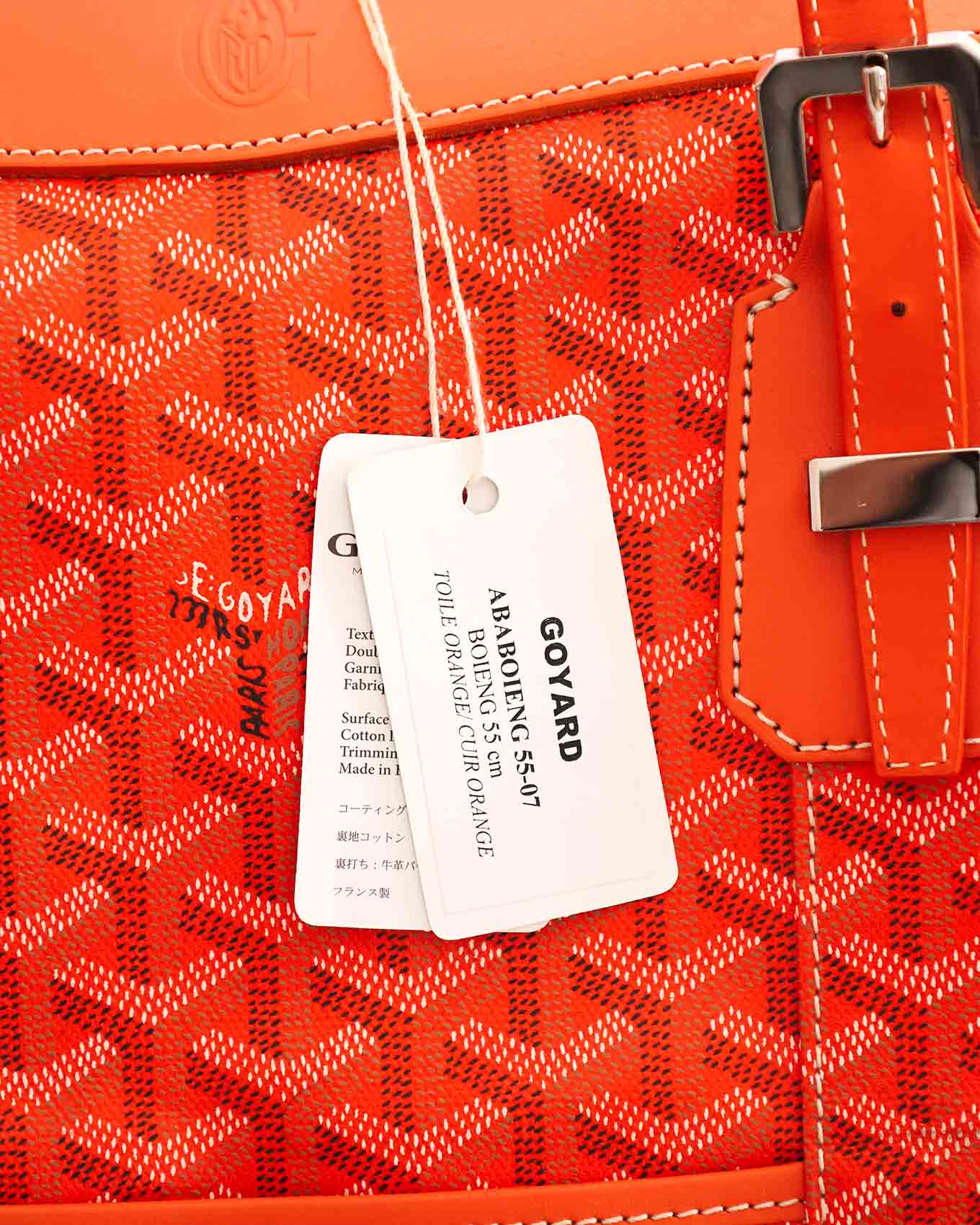 Up for sale is this unused Goyard Boeing 55 in orange Goyardine canvas with leather trim. This bag features the iconic Goyardine Monogram canvas in the orange colorway which is a SO (special order) with a waiting list of around six months. The current european MSRP is 4.950€ for this colorway. The bag features one slit pocket on the exterior, one large compartment with a zipped pocket on the inside, removable leather handles, silver lock closure with two keys and metal feet.