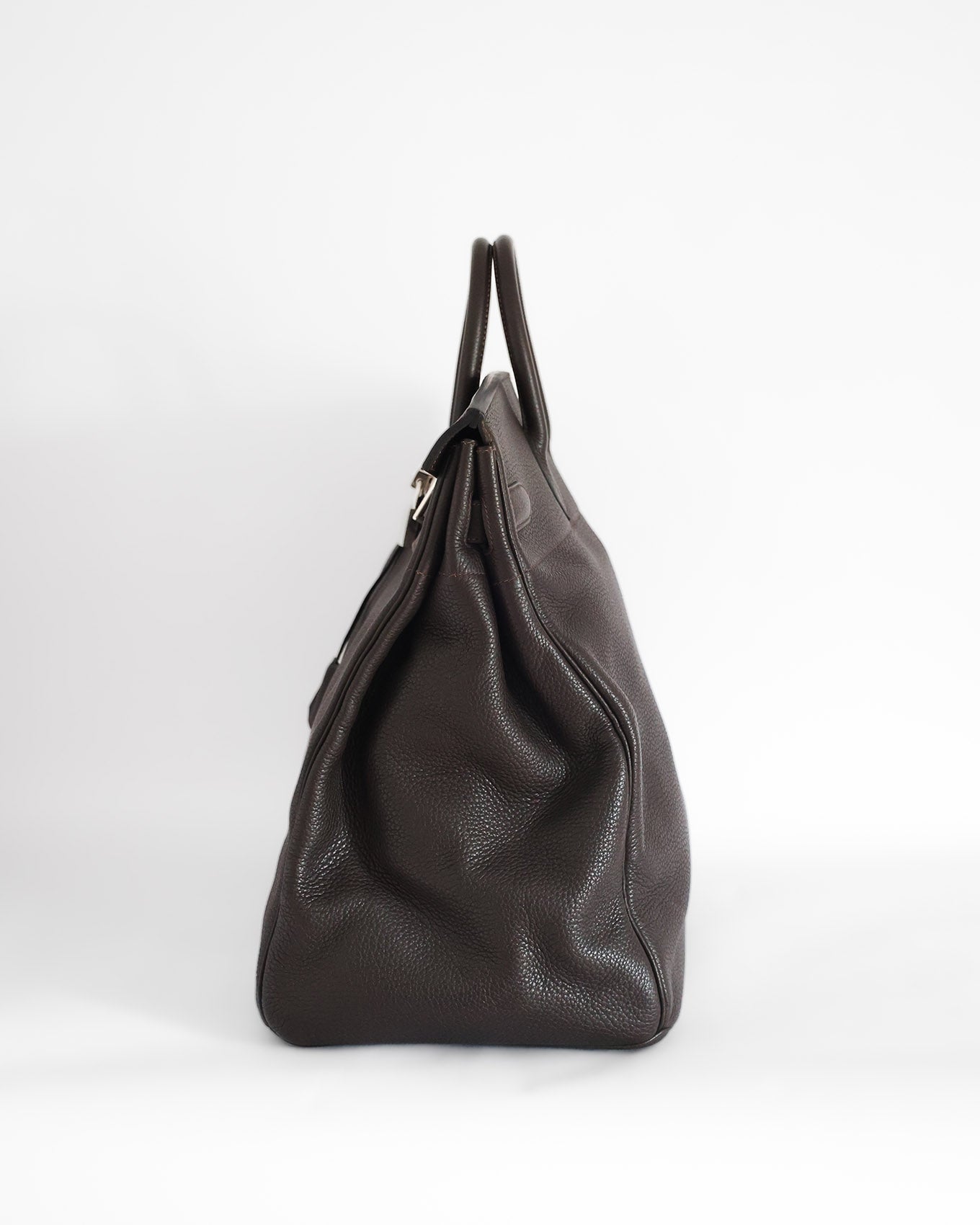 This rare Hermès Birkin HAC 50 in Ebony Togo leather from 2010 is a timeless travel piece loved by collectors. The HAC (Haut à Courroies) is the iconic predecessor to the Birkin, known for its enormous capacity and signature flap and lock closure.