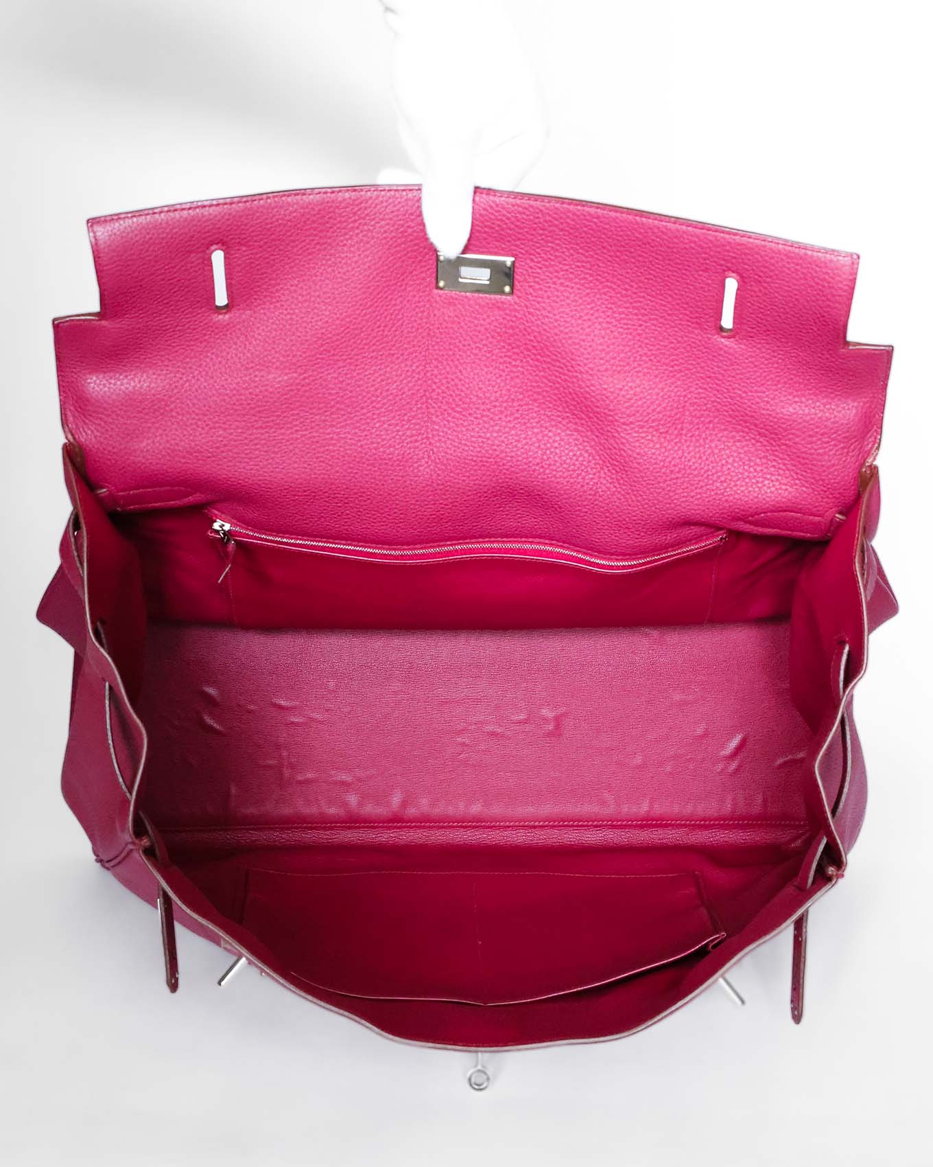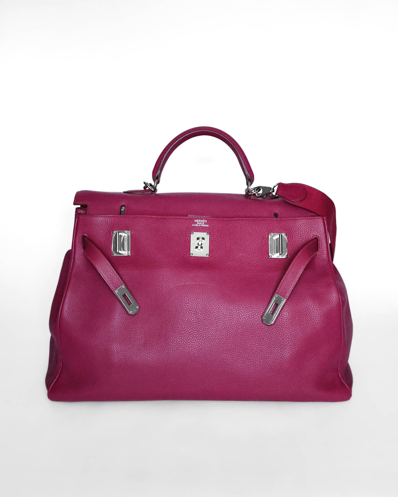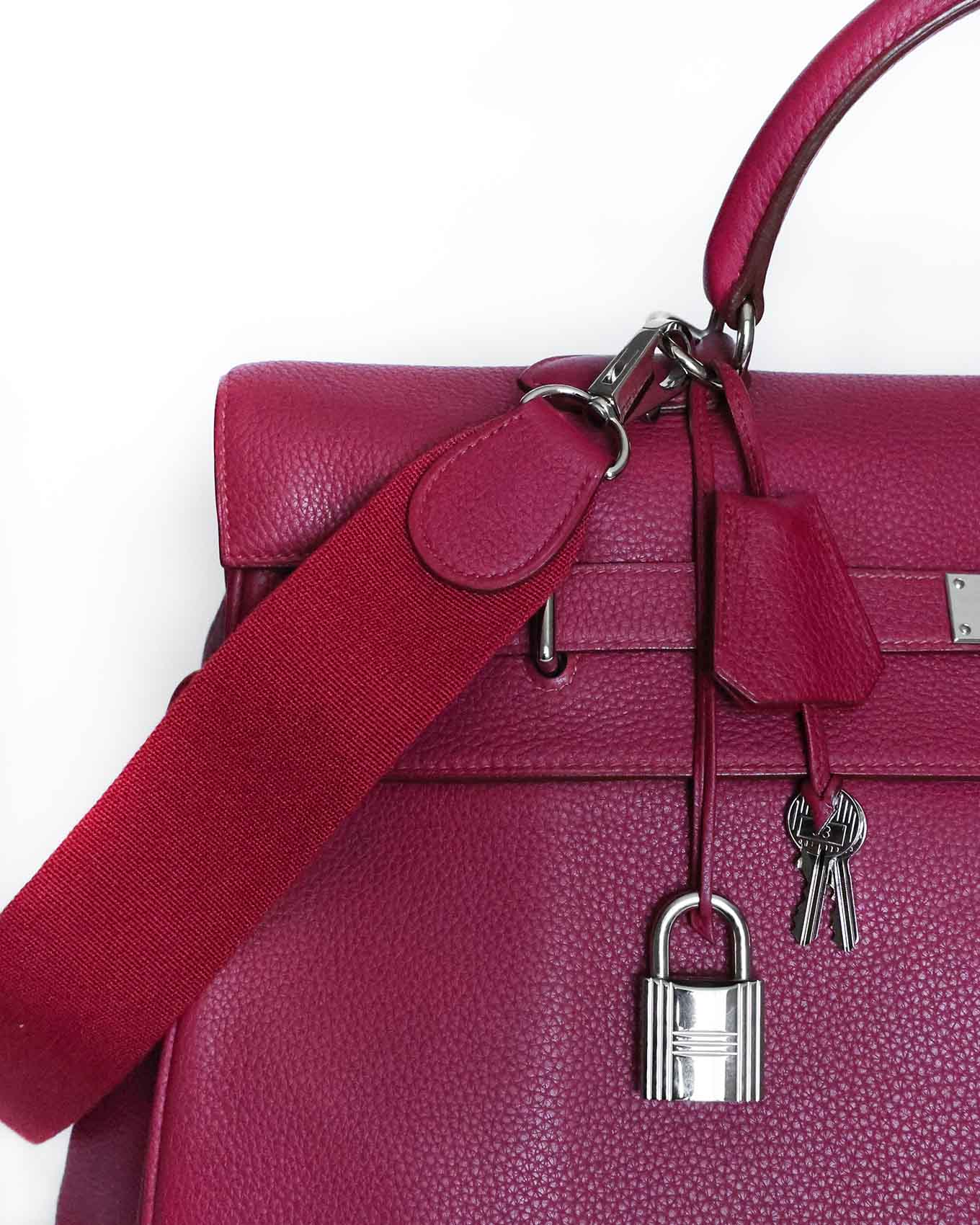 This Hermès Kelly 50 Voyage in Rubis Clémence leather with Palladium hardware is a rare and collectible luxury travel bag from 2010. Known as the Kelly Voyage, this oversized edition of the iconic Kelly bag combines elegance with practicality, making it highly sought after by collectors and luxury enthusiasts worldwide.