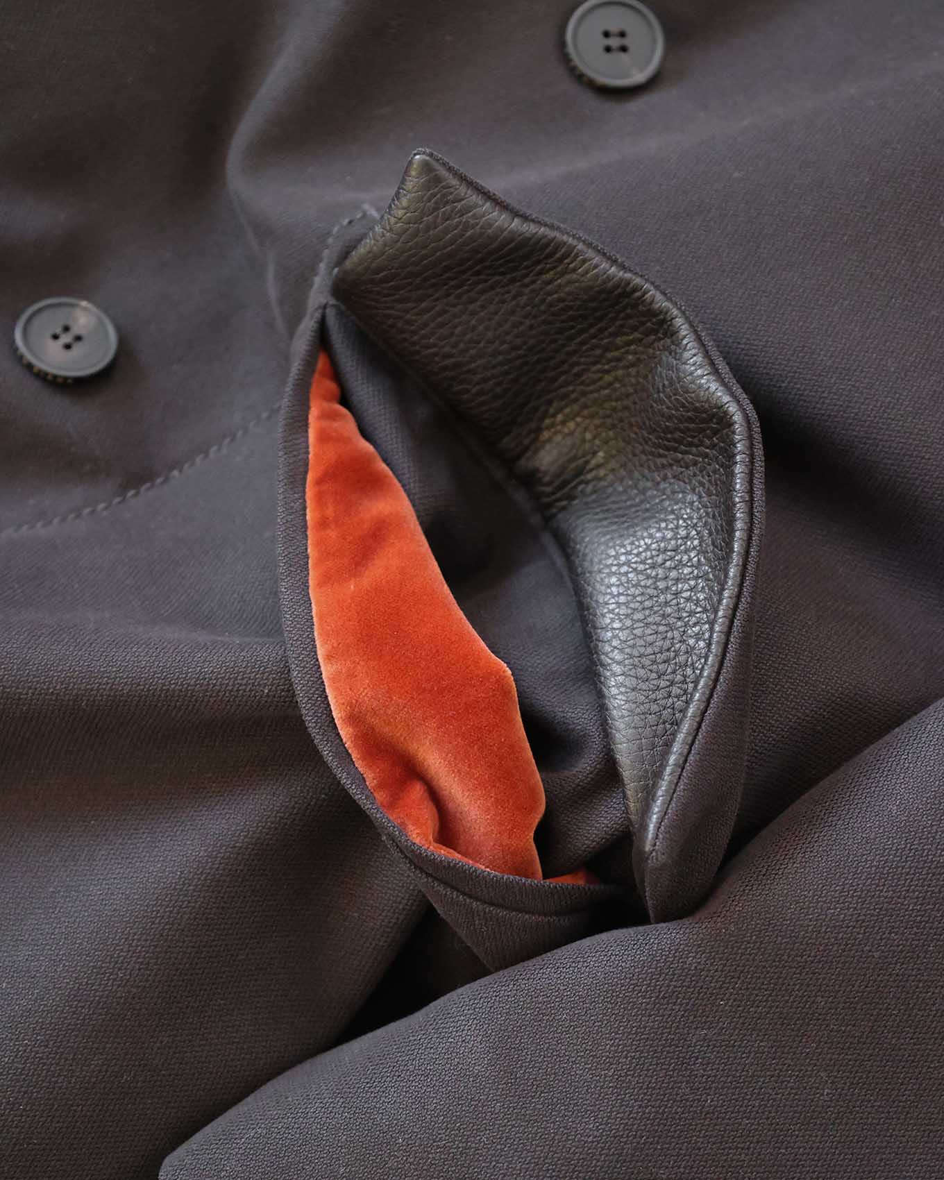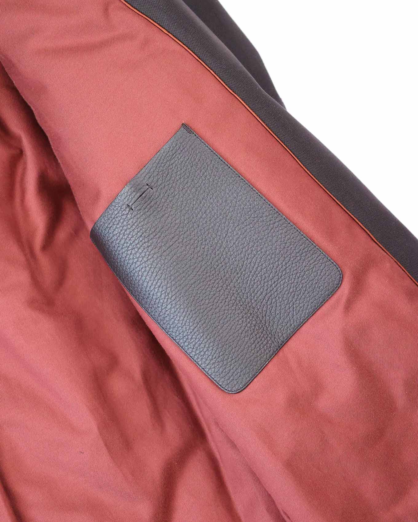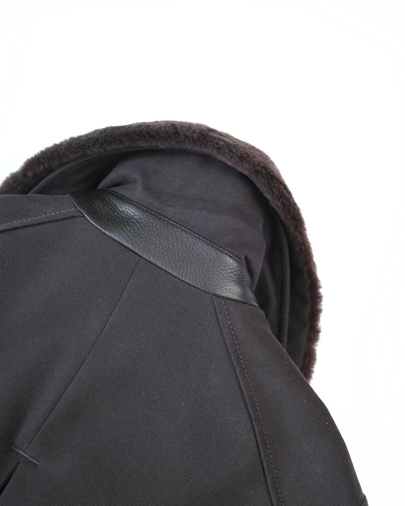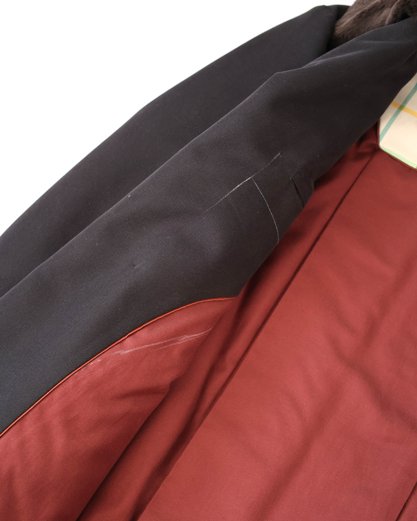 Up for sale is this very elegant and luxurious Loro Piana black cotton heavy belted coat with removable fur collar detail and soft black leather details. This exquisit piece features multiple outer pockets lined in super soft red velvet with black innter flaps as well as two zipped inner pockets and a leather patch pocket. The fur collar is removable and remarkably soft - it is either rabbit or castrino fur.